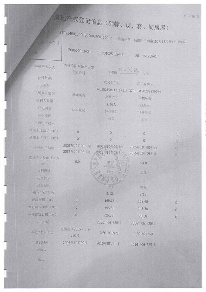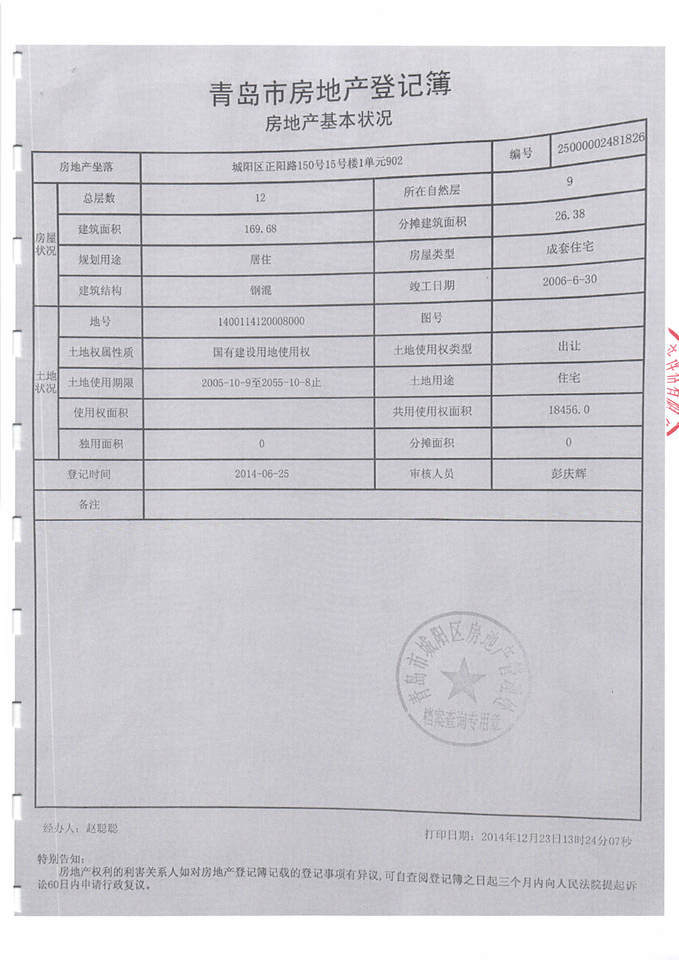 房产坐落 | 青岛市城阳区正阳路150号15号楼1单元902 | 编号 | 25000002481826 | ||